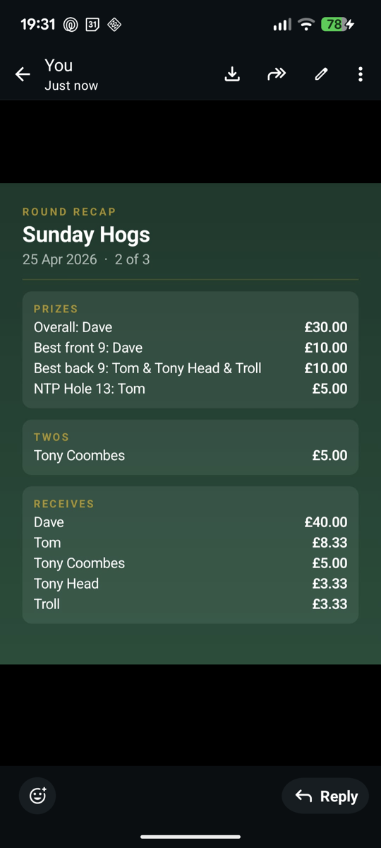 One tap to a clean recap pack - Stableford table, payouts, handicap changes - designed to share, not screenshot.